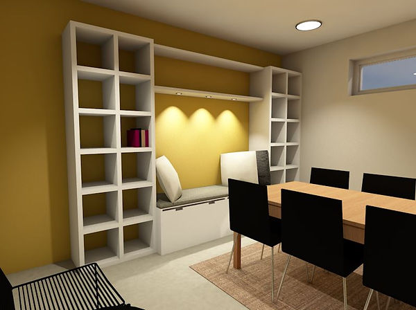 Takaseinälle on sijoitettu kirjahyllyyn integroitu sohva, joka palvelee tarvittaessa lisäistumapaikkoina pöydän ääressä. Seinä on maalattu samalla greipin sävyllä kuin eteisseinä.