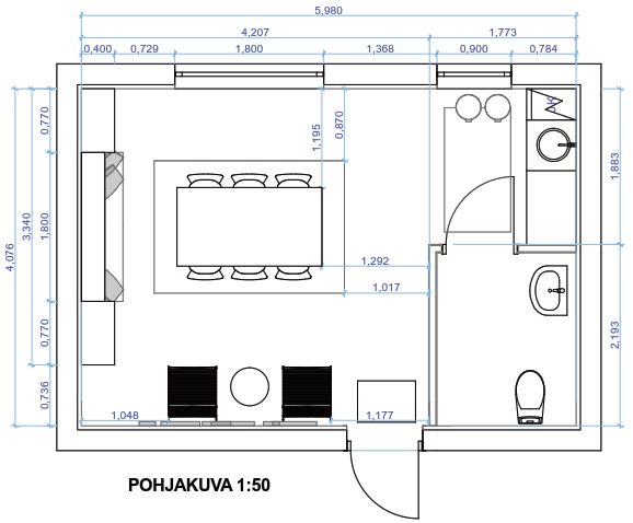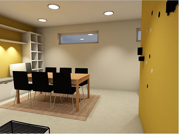 25m2 kerhotilaan oli toiveena saada muunneltava ruokapöytä 8-10 henkilölle, sohva, sohvapöytä, sekä kirjahylly.